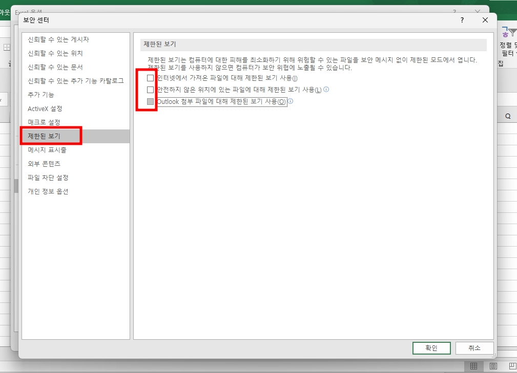 네모칸에 있던 체크표시를 풀어준 후 확인버튼 클릭