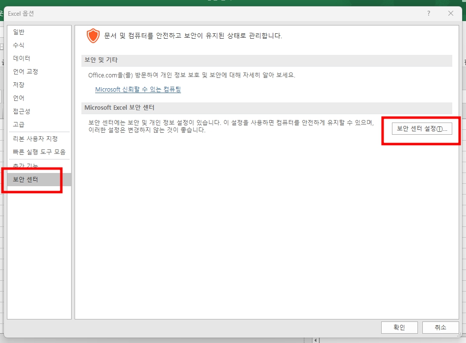 좌측 아래 보안센터 --> 보안센터 설정 클릭